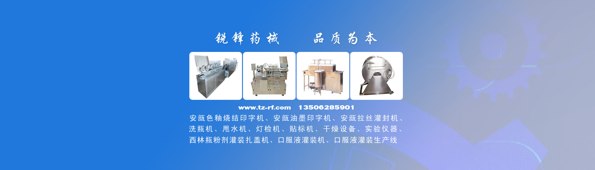公司主要產(chǎn)品有:安瓿色釉燒結(jié)印字機(jī)、安瓿油墨印字機(jī)、安瓿拉絲灌封機(jī)、西林瓶粉劑灌裝機(jī)、洗瓶機(jī)、安瓿甩水機(jī)、燈檢機(jī)、貼標(biāo)機(jī)、口服液灌裝機(jī)、口服液灌裝生產(chǎn)線、制藥機(jī)械、干燥設(shè)備、實(shí)驗(yàn)儀器等,并可根據(jù)客戶要求非標(biāo)定制生產(chǎn)。產(chǎn)品廣泛用于制藥、食品、保健品、化妝品等行業(yè)。